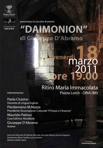 Oria, venerdì 18 marzo 2011 alle ore 19, nella sala conferenze del Ritiro “Maria Immacolata” sita in piazza Lorch ad Oria, presenterà il libro “Daimonion”, antologia poetica del giovane scrittore Giuseppe D’Abramo, già autore cinque anni fa della raccolta “Giardini d’Oblio”.