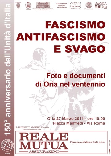 celebrazioni per il 150esimo anniversario per l’Unità d’Italia, interesserà le centralissime piazza Manfredi e via Roma, sul cui tracciato sarà allestita l’esposizione di rare fotografie, preziosi documenti e originali oggetti riguardanti l’Oria del Ventennio fascista, permettendo così ai visitatori di fare un tuffo indietro nel tempo di circa 80 anni anche attraverso la presenza degli esercizi commerciali che per l’occasione si “vestiranno” con riferimenti d’epoca. Interessante anche la sezione dedicata agli oritani antifascisti che militarono contro il regime, aprendo poi la strada verso la democrazia repubblicana. Particolare attenzione sarà dedicata alla tematica dello svago in epoca fascista, impegnato non solo tra i primissimi bar e la piazza del paese, ma anche in attività del cosiddetto “dopolavoro” ed in esercitazioni ginniche per i più giovani.La manifestazione gode del patrocinio della Provincia di Brindisi e della Città di Oria, è si svolgerà in collaborazione con il comitato provinciale di Brindisi dell’Istituto per la Storia del Risorgimento Italiano, l’associazione culturale “Il Pozzo e l’Arancio”, l’associazione “Botteghe di Via Roma” di Oria, il Piccolo Museo del Bar Carone e l’associazione “VisitOria”.