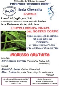 nella coorte del Torrione di Avetrana, si terrà un convegno sul tema: “L’intelligenza innata del nostro corpo. Come lasciare che si esprima nel pieno delle sue potenzialità”.L’iniziativa è finalizzata ad approfondire le tematiche che spaziano dalle Erbe alla Chiropratica allo Yoga.