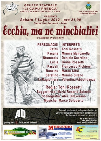 dell’Arci Calypso è lieto di presentare la commedia in vernacolo in due atti: “Vecchiu si, ma no minchialiri”.La rappresentazione avverrà sabato 7 luglio alle ore 21, in piazza San Giovanni a Sava e si inserisce all’interno della rassegna estiva del Giugno Savese.