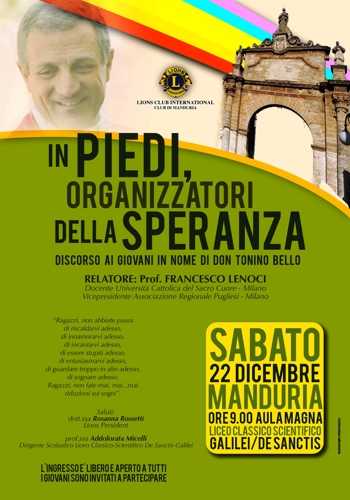 in nome di don Tonino Bello».E’ il tema della conferenza che Francesco Lenoci, docente dell’Università Cattolica del Sacro Cuore di Milano nonché vicepresidente dell’Associazione Regionale Pugliesi di Milano, terrà stamani (sabato), alle 9, presso l’aula magna del liceo classico scientifico “Galilei – De Sanctis”, alle ore 9, avrà luogo la conferenza “In piedi, organizzatori della Speranza”, del professor Francesco Lenoci, docente dell’Università Cattolica del Sacro Cuore di Milano, vicepresidente dell’Associazione Regionale Pugliesi di Milano. Conferenza che è stata promossa dal Lions Club di Manduria e che parte da un auspicio dello stesso prof. Lenoci: «Non basta più enunciare la speranza, ma occorre organizzarla».