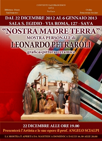 al convento dei Frati Francescani di Sava. Oggi (sabato), alle 19, sarà inaugurata, nella sala “S. Egidio” del convento, la mostra personale di grafica, pittura e ceramica che l’artista Leonardo Petraroli ha dedicato alla “Nostra Madre Terra”. Alla cerimonia di inaugurazione l’artista e le sue opere saranno presentate da Angelo Scialpi.La mostra sarà visitabile sino al 6 gennaio dal martedì alla domenica, dalle 16,30 alle 20.