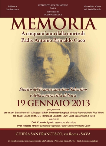 Antonio Primaldo Coco, storico del Francescanesimo Salentino e della città savese, a mezzo secolo dalla sua morte. Lo promuove il convento di San Francesco di Sava, una delle agenzie più attive nel campo della cultura in questa cittadina, in collaborazione con l’assessorato alla Cultura del Comune di Sava, con la Pro Loco di Sava, con l’Ordine dei Frati Superiori e con il prof. Cosimo Aquilino.Sabato prossimo, dopo la celebrazione della funzione religiosa in suffragio di padre Coco da parte di padre Tommaso Leopizzi, Ministro Provinciale dei Padri Minori all’interno della chiesa di San Francesco (alle 18), avrà inizio il convegno con il saluto del sindaco di Sava, Dario Iaia.