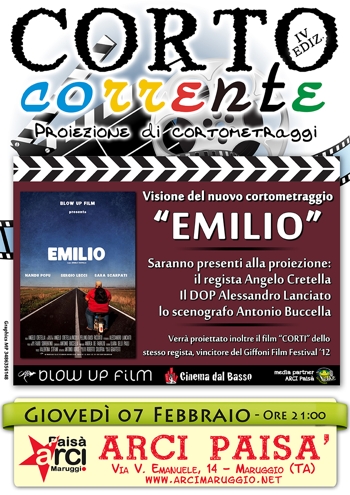 edizione di CORTO-Corrente, che si terrà nella propria sede (Via V. Emanuele, 14 - Maruggio), oggi (giovedì 7 febbraio) alle ore 21, presenta l’anteprima del cortometraggio EMILIO, nuovo lavoro del pluripremiato regista Angelo Cretella, prodotto da Blow Up Film, una giovane associazione culturale nata nel 2008 in provincia di Caserta con lo scopo di produrre opere cinematografiche indipendenti e a tema sociale.