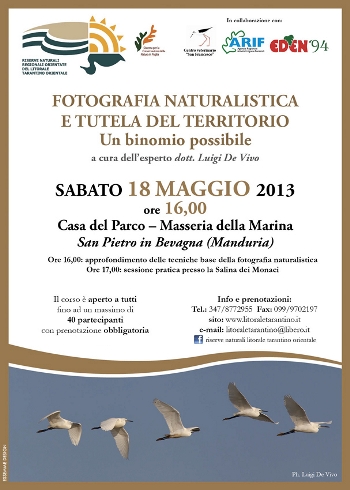 alla tutela del territorio in cui opera? Può con la divulgazione delle immagini che ritraggono flora e fauna di un determinato habitat sviluppare una certa coscienza ecologica nell’osservatore? Fare fotografia naturalistica oggi richiede certamente un impegno maggiore che va al di là del semplice scatto fine a se stesso. Ecco allora che la difesa degli habitat costituisce un adempimento imprescindibile. Questo sarà l’argomento dell’incontro che si terrà con Luigi De Vivo, biologo e fotografo naturalista, una proiezione di immagini per conoscere le bellezze naturalistiche del nostro territorio, ed imparare ad apprezzarle per la nostra corretta fruizione e di quella delle generazioni future.L’evento prevede una sessione teorica presso la Casa del Parco - Masseria Marina (San Pietro in Bevagna - Manduria), durante la quale verranno illustrate le tecniche di base della fotografia naturalistica.