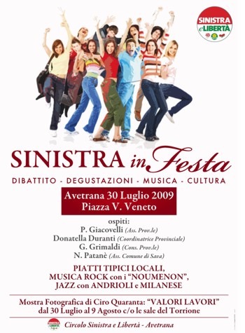 Questa iniziativa è inserita nel quadro di “Sinistra in festa”, la manifestazione di Sinistra e Libertà, che si tiene domani sera ad Avetrana. E’ previsto un dibattito in piazza Vittorio Veneto, al quale parteciperanno l’assessore provinciale Peter Giacovelli, la coordinatrice provinciale di Sinistra e Libertà Donatella Duranti, il consigliere provinciale dello stesso movimento Grimaldi e l’assessore comunale di Sava Natty Patanè.