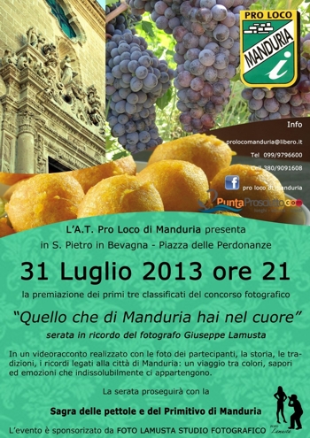Primitivo per onorare la memoria di un fotografo manduriano, scomparso prematuramente nel corso di quest’anno.A lanciare l’iniziativa è la Pro Loco di Manduria, che inaugura il proprio programma estivo mercoledì 31 luglio con l’iniziativa dedicata a Giuseppe Lamusta e con la premiazione dei primi tre classificati del concorso fotografico “Quello che di Manduria hai nel cuore”. Si possono inviare le fotografie degli scorci più belli della città messapica e, poi, sperare si salire sul podio dei premiati.