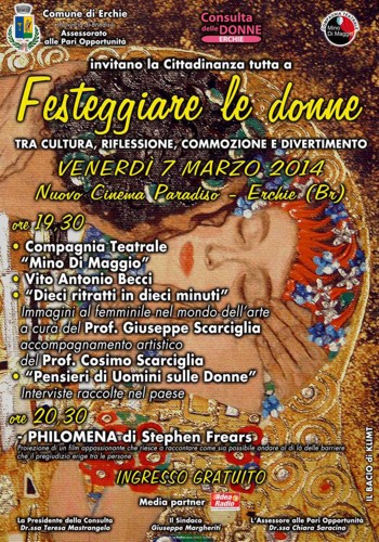 L’evento, che si svolgerà al Cinema Paradiso a partire dalle ore 19.30, sarà aperto da una performance teatrale a cura della Compagnia Mino di Maggio e proseguirà con “Dieci ritratti al femminile in dieci minuti” a cura del Prof. Giuseppe Scarciglia, accompagnato al pianoforte dal prof. Cosimo Scarciglia – un racconto di 1 minuto per 10 opere d’arte che hanno come protagonista la donna. Al termine saranno presentate le videointerviste raccolte in città dal titolo “Pensieri di uomini sulle donne”. L’intrattenimento sarà a cura di Vitantonio Becci. La serata si concluderà alle 20.30 con la proiezione del film di Stephen Frears PHILOMENA.