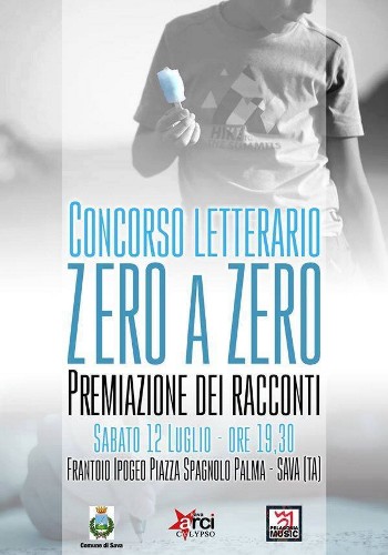presso il Frantoio Ipogeo di Piazza Spagnolo Palma a Sava, avverrà infatti la premiazione del concorso letterario “Zero a Zero”, concepito per premiare il talento ma soprattutto per promuovere l'arte e la cultura in un'ottica inclusiva e dedicato alla memoria di due amici che ci hanno prematuramente lasciato di recente.La prima parte del concorso, rivolta agli scrittori in erba di tutto il mondo, è dedicata alla memoria di un insostituibile amico, figlio e fratello, Stefano Fontana, venuto a mancare nell'agosto 2011 in Valcamonica, che il 12 giugno del 2013 è stato ricordato nella Sala Amphipolis del Comune di Sava con la presentazione del suo libro postumo intitolato "Zero a Zero".
