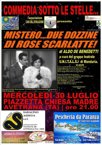 trascorrere tra risate e spensieratezza sotto le stelle di mezza estate, con la commedia Mistero (Due dozzine di Rose Scarlatte) interpretata dal gruppo teatrale U.N.I.T.A.L.S.I. di Manduria.