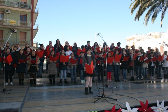 “Va’, dillo alla montagna”), e poesie (“Platani di Natale” recitata da Lorenzo Prudenzano; “E’ Natale” interpretata da Gabriella Ricci, Daniele Scorrano ed Ester Coluccia; “Preghiera a Gesù bambino” interpretata da Giorgia Piscopiello e Barbara Maggi; “Natale”, interpretata da Teresa Albano). Il coro è stato diretto dal docente Massimiliano De Razza, mentre le poesie sono state scelte dalla docente Maria Pina Leone.