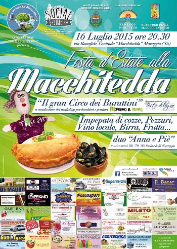 “Festa d’ Estate”, ormai giunta alla sua II edizione, organizzata dall’ Associazione rionale “La Macchitedda” con il patrocinio del comune di Maruggio, la collaborazione dell’Associazione Turistica “Proloco di Maruggio” e in partnership con l’A.P.S. “Play your Place - Il luogo in gioco” di Maruggio .