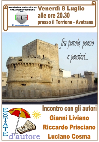 “Estate d’autore, fra parole, poesie e pensieri”. E’ l’evento in programma domani, alle 20,30, all’interno del torrione di Avetrana. Promosso dall’associazione “Casa dell’evoluzione”, proporrà l’incontro con tre autori diversi, che presenteranno i rispettivi libri: Gianni Liviano, consigliere regionale e consigliere comunale di Taranto, già assessore alla Cultura della Regione Puglia, presenterà il testo “Del nostro meglio, lettera a un figlio”; Riccardo Prisciano, avetranese, maresciallo dell’Arma dei Carabinieri e consigliere comunale del comune di Tarcento, in provincia di Udine, presenterà il saggio “Nazislamismo”; infine Luciano Cosma, di Erchie, segretario presso uno studio medico, presenterà la raccolta di poesie “Ghiaccio che Brucia”.