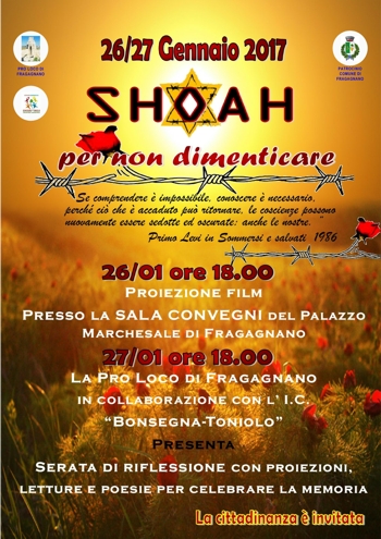 «In occasione di questa giornata, la Pro Loco di Fragagnano (gruppo Nati per Leggere e Biblioteca Elena Dell’Antoglietta), in collaborazione con l’istituto “Bonsegna-Toniolo”, organizza alcuni momenti comuni di narrazione dei fatti e di approfondimento sul genocidio sistematico di milioni di individui, perpetrato tra il 1938 e il 1945, ad opera del nazifascismo» annuncia Nunzia Digiacomo della Pro Loco di Fragagnano. «Le iniziative, rivolte ad un pubblico di tutte le età, ma con particolare attenzione ai bambini, ai ragazzi e ai giovani che saranno essi stessi parte attiva, si svolgeranno presso la sala convegni del palazzo Marchesale, a partire dalle ore 17.30».