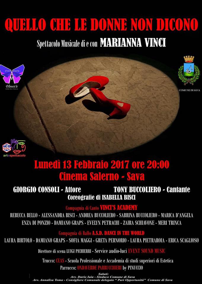 spettacolo musicale che sarà rappresentato questa sera al teatro Vittoria di Sava. Attraverso canti, balli e poesie, si denuncerà la violenza sulle donne. Scritto e interpretato dall’artista savese Marianna Vinci, vedrà in scena la compagnia “Vinci’s Academy Music Production” e, con essa, si avvarrà della partecipazione del cantautore Tony Buccoliero, di 9 ballerini coreografati da Isabella Vinci (quest’ultima partecipa come danzatrice del ventre), con letture interpretate dall’attore Giorgio Consoli.