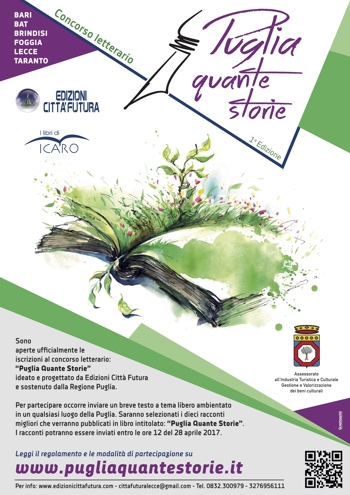 letterario ‘Puglia Quante Storie’, un’iniziativa, alla sua prima edizione, nata su idea e progetto della casa editrice leccese Edizioni Città Futura.Una competizione che altro non è che l’evoluzione del concorso ‘Salento Quante Storie’, rivolto agli scrittori di origine salentina e non a cui veniva chiesto di scrivere un breve racconto con l’obbligo di ambientarlo nelle terre comprese tra le province di Lecce, Brindisi e Taranto. Dopo quattro splendide edizioni, ‘Salento Quante Storie’ cambia, cresce e si evolve e nasce così ‘Puglia Quante Storie’, un progetto lungimirante sostenuto dall’Assessorato all’Industria Turistica e Culturale della Regione Puglia, Gestione e Valorizzazione dei Beni Culturali che l’ha riconosciuta come una delle iniziative più rilevanti tra quelle organizzate sul territorio. Il grande successo avuto in pochi anni ha portato gli organizzatori ad allargare, quindi, il target di concorrenti.