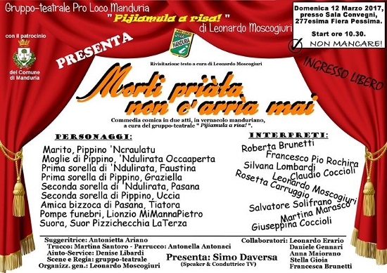 La Pro Loco di Manduria preannuncia una grande carica di umorismo nella giornata conclusiva della Fiera Pessima: domenica 12 marzo, alle ore 10:30, presso la sala convegni, con ingresso gratuito, l’Associazione avrà il piacere di presentare al pubblico “Morti priàta non c’arrìa mai”, commedia in due atti, in vernacolo manduriano, ultimo lavoro della compagnia teatrale della Pro Loco di Manduria “Pijiamula a risa!” di Leonardo Moscogiuri e la prima opera interamente scritta e realizzata dal gruppo-teatrale.