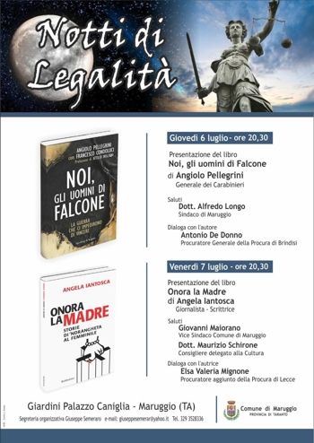 A proposito di cultura oggi e domani si terrà la manifestazione denominata “Notti di legalità”, una rassegna che prevede la presentazione di due libri con ospiti e autori di rilievo. Le due serate si svolgeranno presso i giardini di Palazzo Caniglia con inizio alle ore 20.30.