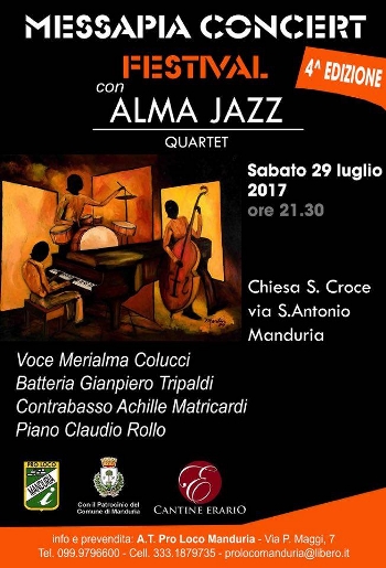edizione del Messapia Concert Festival, evento promosso dalla Pro Loco di Manduria in collaborazione con il CEA, Legambiente e la Cantina Vinicola Erario. L’overture quest’anno è affidata agli Alma Jazz Quartet, che accenderanno, con il loro sound, una notte di fine luglio e concilieranno il desiderio di ascoltare buona musica e la voglia di trascorrere un paio d’ore in compagnia sotto il cielo stellato.