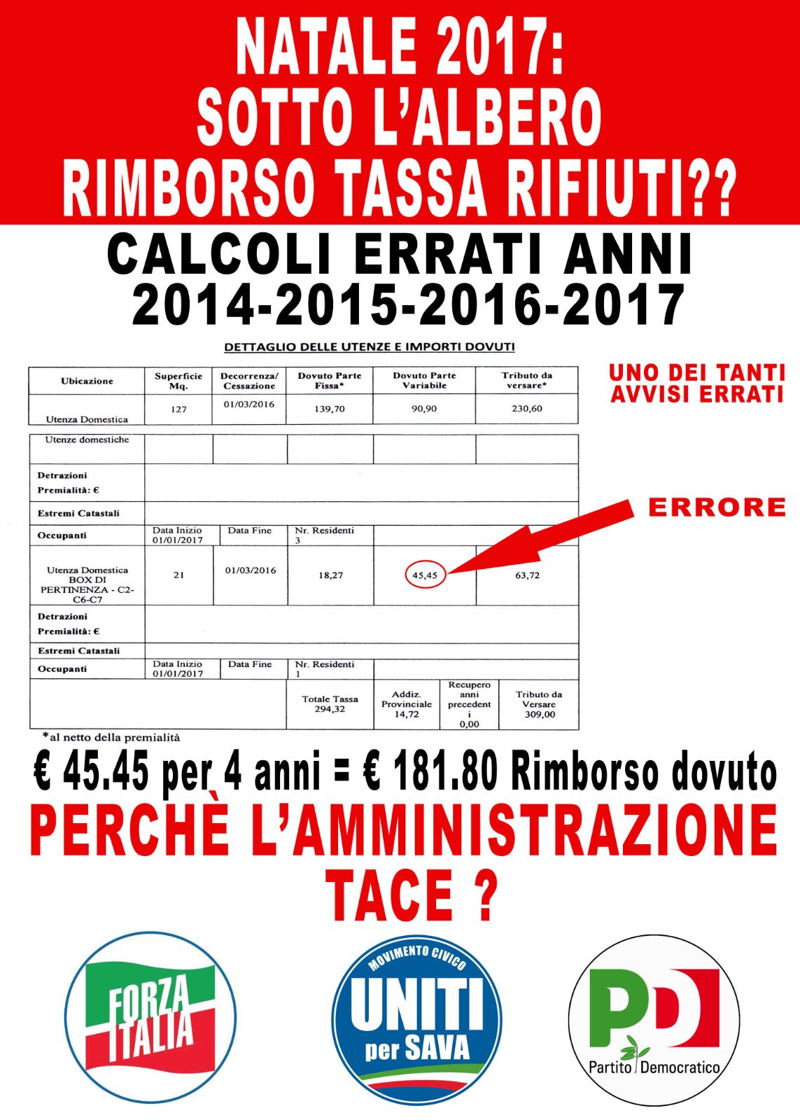 «Dopo quasi due mesi, finalmente il sindaco Iaia rompe il silenzio e con un post su facebook ammette che il Comune di Sava ha sbagliato a calcolare una quota della TARI, chiedendo e incassando da alcuni contribuenti somme non dovute» rimarca De Cataldo. «Il dettaglio della vicenda, esposta chiaramente dal dott. Giulio Rossetti, riguarda i rimborsi della TARI illegittima su garage, cantine e altre pertinenze, già certificata dal dipartimento Finanze.