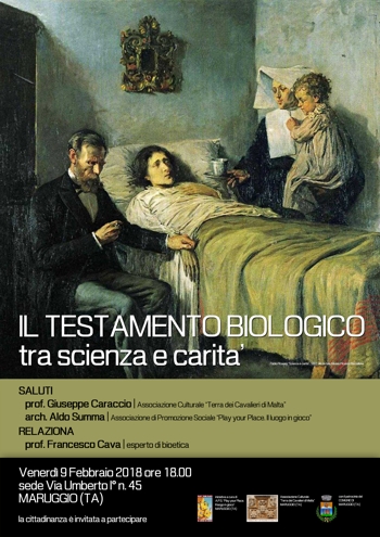 Si svolgerà questa sera, presso i locali ubicati in via Umberto I n° 45 in Maruggio, l’incontro informativo sul tema “Il testamento biologico tra scienza e carità”, durante il