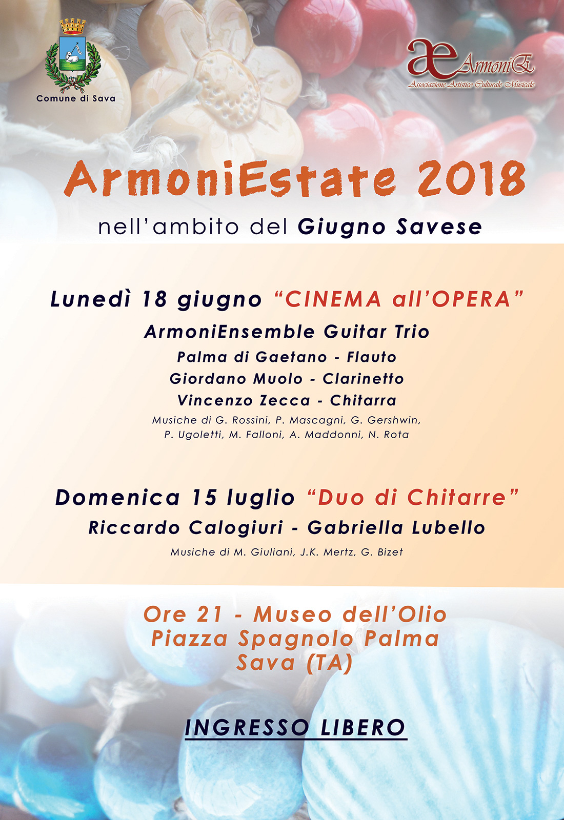 “Armoni Ensemble Guitar Trio” in concerto questa sera nella splendida cornice del Museo dell’Olio di piazza Spagnolo Palma. Inserito nel programma del “Giugno Savese”, rassegna pluriennale che unisce la cultura musicale, teatrale e delle arti a eventi sportivi ed enogastronomici nella città di Sava, il concerto proporrà un programma di composizioni originali e colonne sonore rivisitate per flauto, con brani firmati da Gershwin, Rossini, Ugoletti, Rota, Maddonni, Falloni.