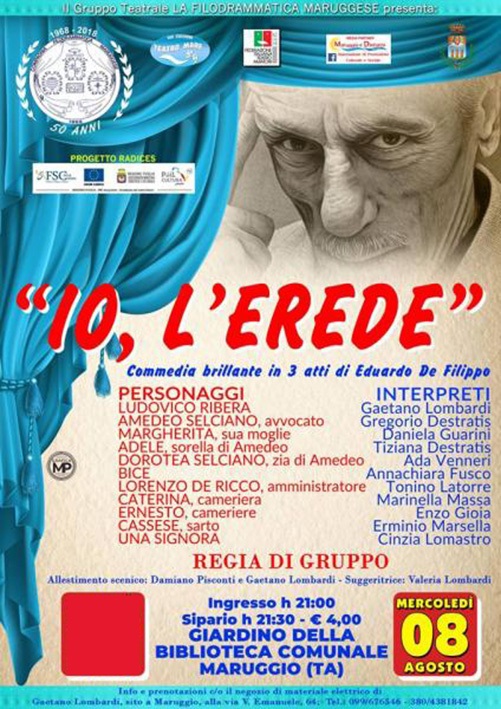 Questa sera, alle ore 21, presso il giardino della biblioteca comunale, in piazza San Giovanni, “La Filodrammatica Maruggese” rappresenterà la commedia “Io erede” di Eduardo De Filippo. Si tratta di una commedia brillante in tre atti, apparentemente stravagante grazie ai geniali intrecci tipicamente “eduardiani” tra le tematiche pirandelliane e la farsa napoletana.