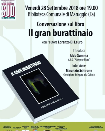 Oggi (venerdì), alle 19, presso la biblioteca comunale di Maruggio, si terrà una nuova presentazione del libro “Il gran burattinaio” di Lorenzo Di Lauro. Il giovane autore messapico presenterà il suo romanzo d’esordio con la collaborazione dell’associazione culturale “Maruggiu Mia” e il patrocinio del Comune di Maruggio.