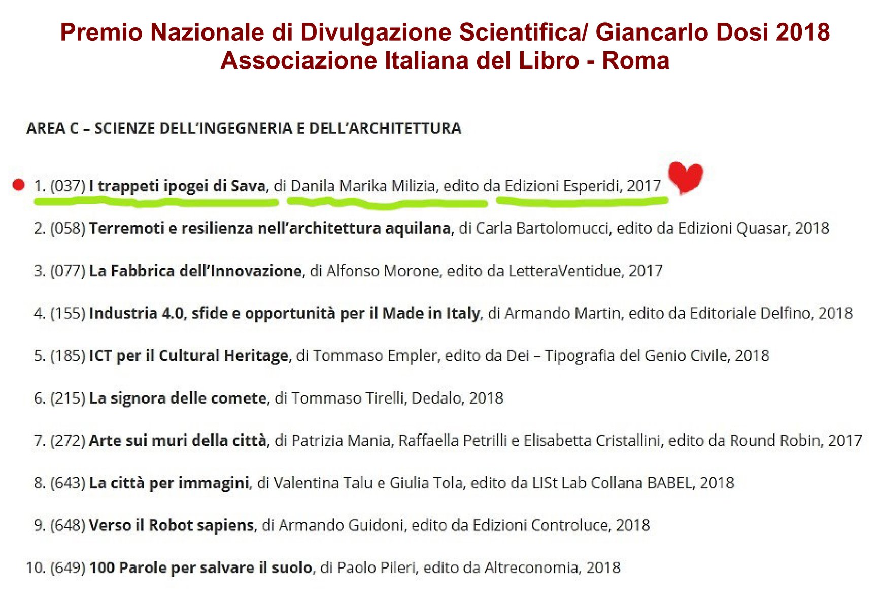Marika Danila Milizia, edito da Esperidi, è finalista tra i dieci titoli selezionati per il Premio Nazionale di Divulgazione Scientifica “Giancarlo Dosi”, sezione “Scienze dell’Ingegneria e dell’Architettura”.
