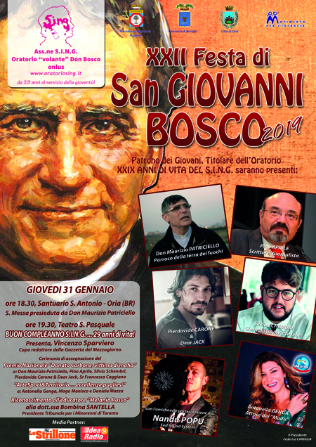 «Giunge gennaio, giunge la festa di Don Bosco – afferma il fondatore del S.I.N.G., ideatore della Festa di San Giovanni Bosco e vicepresidente nazionale del Movimento per l’Infanzia – per noi non solo un impegno grandissimo, ma una grande gioia. La gioia dei figli che celebrano il Padre, la gioia dei ragazzi che si stringono attorno alla guida! Siamo contenti della programmazione realizzata per la festa di San Giovanni Bosco, vi aspettiamo a braccia aperte per vivere una serata commovente e divertente».