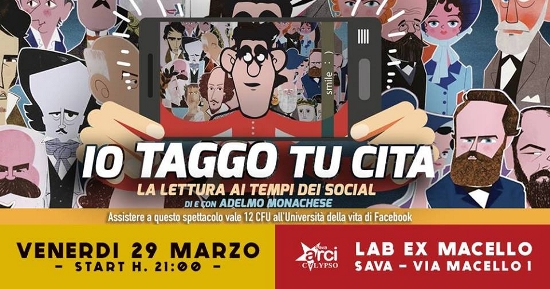 E’ il tema del nuovo reading satirico di Adelmo Monachese, intitolato “Io taggo, tu cita”, che sarò proposto questa sera, alle 21, presso il laboratorio urbano “ex macello” di Sava dal circolo Arci Calypso.
