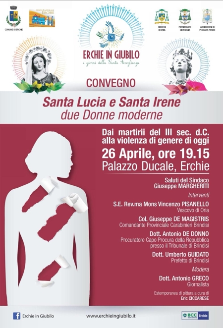 L’iniziativa si colloca nell’ambito dell’eccezionale evento “Erchie in Giubilo. I giorni della Santa Accoglienza”, con l’Ostensione - dal 24 aprile al 4 maggio p.v. - dei Sacri Corpi delle Sante Lucia ed Irene che giungeranno, custoditi nelle teche di cristallo, rispettivamente da Venezia e Catignano.
