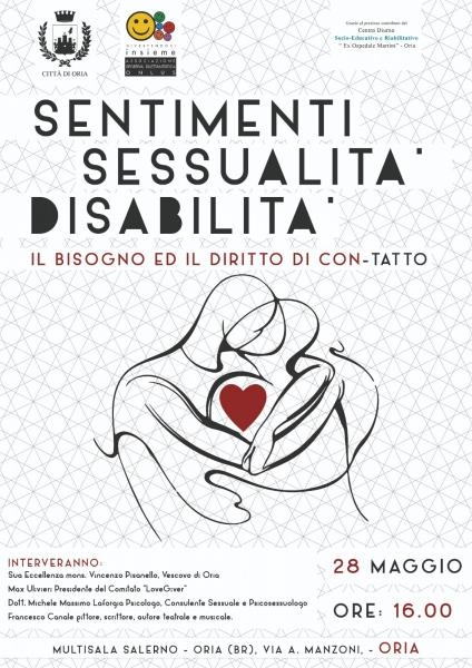 L’associazione sportiva dilettantistica “Divertendoci Insieme”, che opera nel settore dell’attività sportiva paralimpica e che da diversi anni è altresì impegnata nell’organizzazione e promozione di eventi di formazione rivolti a famiglie ed operatori socio sanitari, educativi e scolastici che, a diverso titolo hanno a che fare con il mondo della disabilità, con il patrocinio del Comune di Oria, si incontrerà oggi pomeriggio (martedì), a partire dalle ore 16, presso il Multisala Salerno di Oria, per parlare di “sentimenti, sessualità, disabilità” alla cittadinanza, alle famiglie di persone disabili, alle figure istituzionali, alle associazioni ed ai servizi del territorio, per proporre alcuni spunti di riflessione e provare insieme a intraprendere nuovi percorsi su questa delicata tematica.
