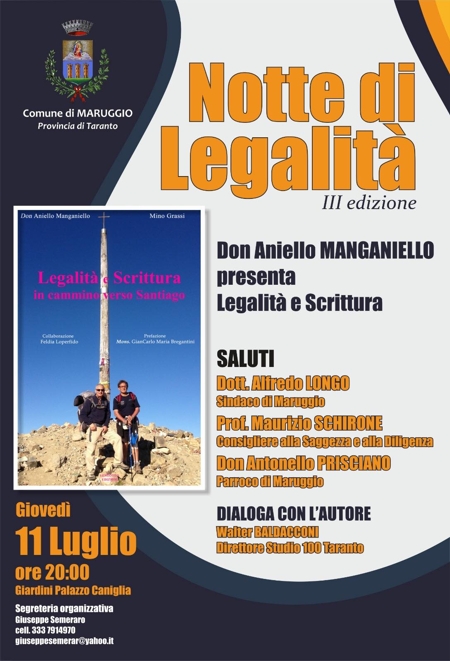 Al via la III edizione della “Notte di Legalità” che si terrà oggi (giovedì 11 luglio) a partire dalle ore 20 presso i giardini di Palazzo Caniglia, con la presentazione del libro “Legalità e scrittura: in cammino verso Santiago” scritto a quattro mani dal giornalista-editore Mino Grassi e da don Aniello Manganiello, il noto sacerdote anticamorra, già parroco di Scampia, da sempre impegnato nel sociale e fondatore dell’associazione Ultimi per la Legalità.