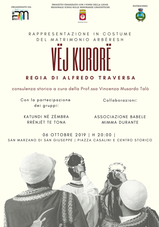 La Pro Loco Marciana rimette in scena lo spettacolo in costume arberesh “Vej Kurore”, espressione della lingua arbereshe la cui traduzione è “prendere corona”, il modo con cui si indicava nelle comunità arbereshe italo-albanesi l’unione di due giovani in matrimonio. La manifestazione si terrà domenica 6 ottobre, alle ore 20, nel centro storico di San Marzano di San Giuseppe. In un’ora, si proverà a raccontare quello che accadeva durante la settimana degli sposi nella comunità arbershe sanmarzanese.