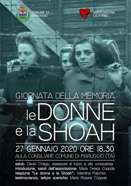 In occasione della Giornata della Memoria, questa sera, ore 18:30, presso la sala consiliare di Maruggio è in programma un incontro pubblico, organizzato dal Comune di Maruggio e dall’associazione “Cicatrici”, intitolato “Le Donne e la Shoah”.