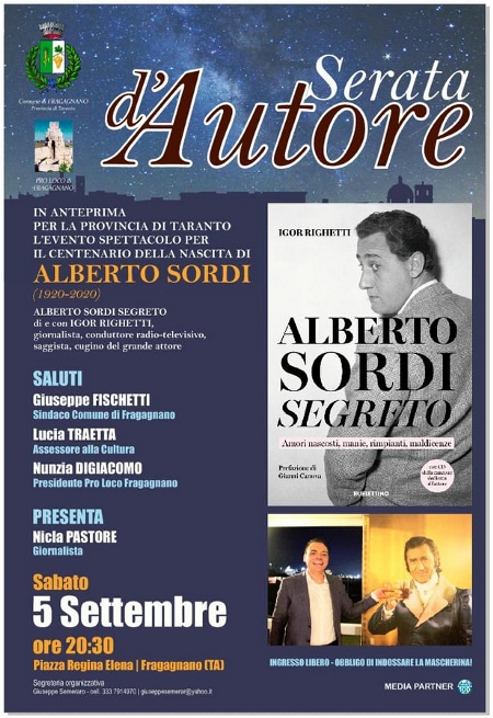 Sabato 5 settembre alle 20.30, in piazza Regina Elena, a Fragagnano, si svolgerà l’eccezionale evento-spettacolo che sta riscuotendo grande successo in tutta Italia: “Alberto Sordi segreto” , ideato e condotto dal giornalista e conduttore radiotelevisivo Rai Igor Righetti (“Il ComuniCattivo” su Rai Radio 1, Rai2 e Tg1 libri), cugino del grande attore da parte della madre di Sordi, Maria Righetti. Interverranno Giuseppe Fischetti, sindaco di Fragagnano; Lucia Traetta, assessore alla Cultura e Nunzia Digiacomo, presidente della Pro Loco di Fragagnano. L’autore sarà presentato dalla giornalista Nicla Pastore.