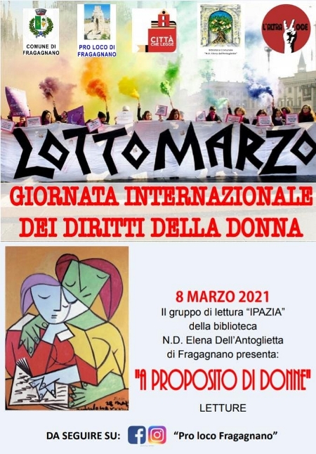 Il gruppo di lettura “Ipazia” della biblioteca “Elena Dell’Antoglietta” di Fragagnano propone per oggi “A proposito di donne“, uno spazio che raccoglie reading e non solo per raccontare l’universo femminile nella giornata dedicata alla donna.