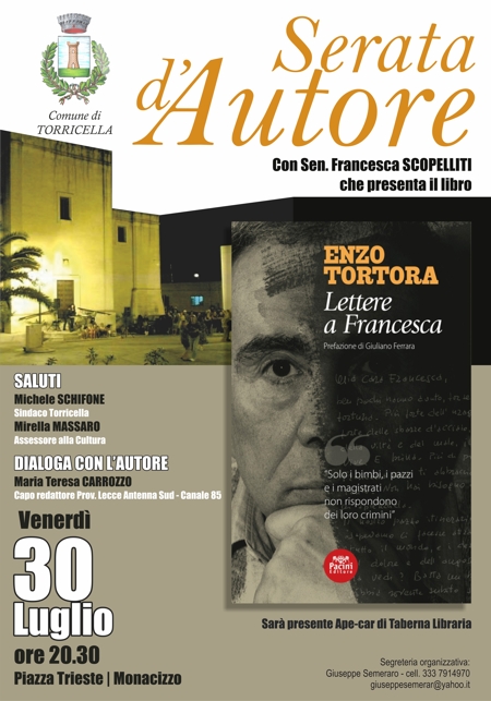 L'Amministrazione comunale di Torricella, nell’ambito delle iniziative culturali dell'estate 2021, ha organizzato per venerdì 30 luglio dalle ore 20:30, nel bellissimo Borgo di Monacizzo, in piazza Trieste, un evento con la Senatrice Francesca Scopelliti, giornalista e compagna del compianto Enzo Tortora, che presenterà il libro "Enzo Tortora. Lettere a Francesca". Dialogherà con l'autrice Maria Teresa Carrozzo, capo redattore della provincia di Lecce per Antenna Sud-Canale 85