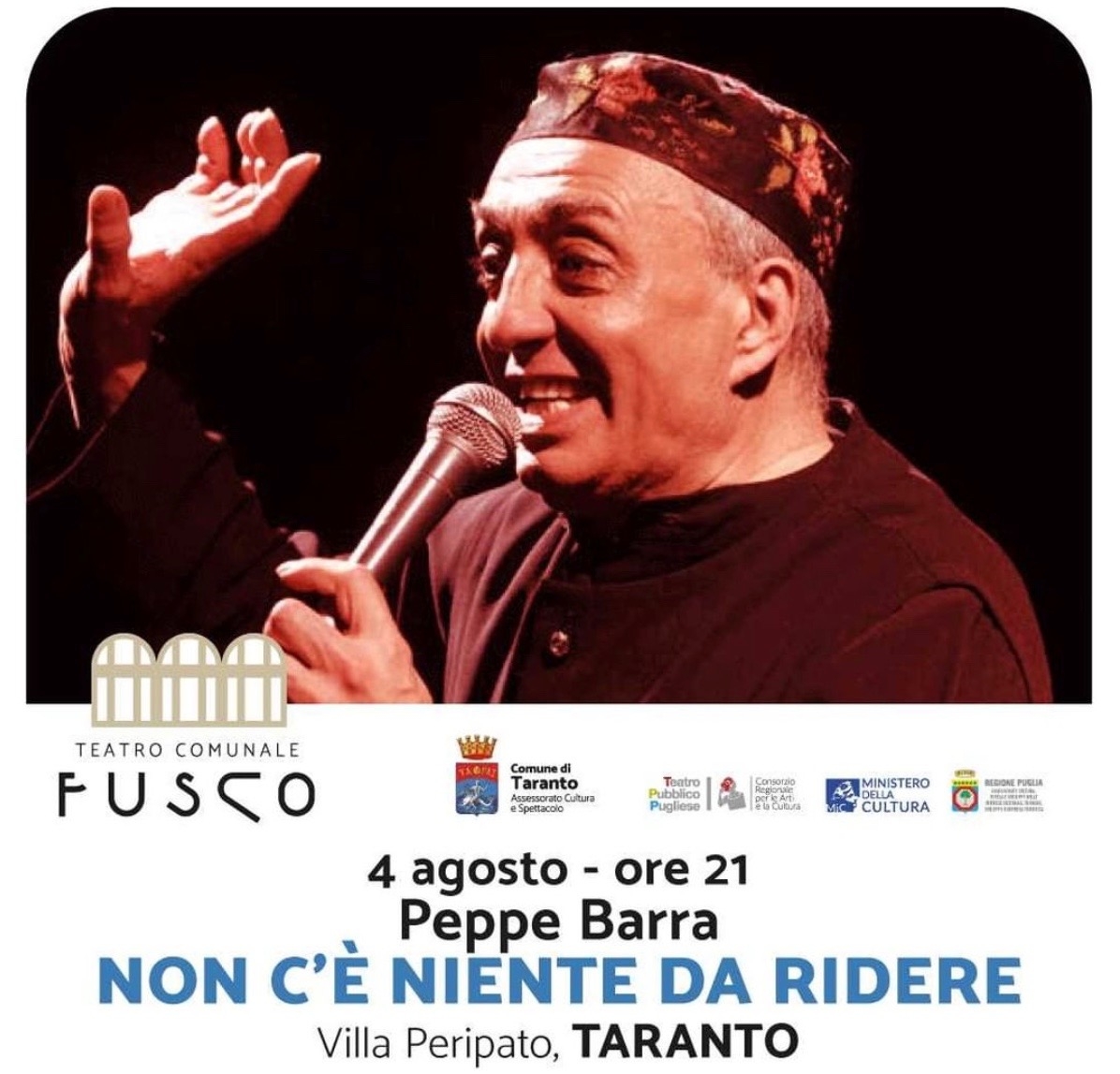 Prosegue la stagione estiva di prosa tarantina, con Peppe Barra in scena domani dal palco della villa Peripato con lo spettacolo “Non c’è niente da ridere”, una vera e propria dichiarazione d’intenti verso il pubblico da parte dell’attore e cantante. L’opera è scritta da Lamberto Lambertini e dallo stesso Barra, che condivide il palco con Lalla Esposito in questo viaggio metateatrale in cui i protagonisti si alternano in duetti, monologhi, canzonette, di antico e moderno repertorio, oltre a improvvise incursioni surreali nel repertorio dei classici, il tutto all’interno di un teatro “rivoltato”, al contrario, con le file dei palchi sul fondo e con le luci della ribalta puntate verso la sala, un luogo dai consunti fondalini dipinti a delineare le situazioni drammatiche.
