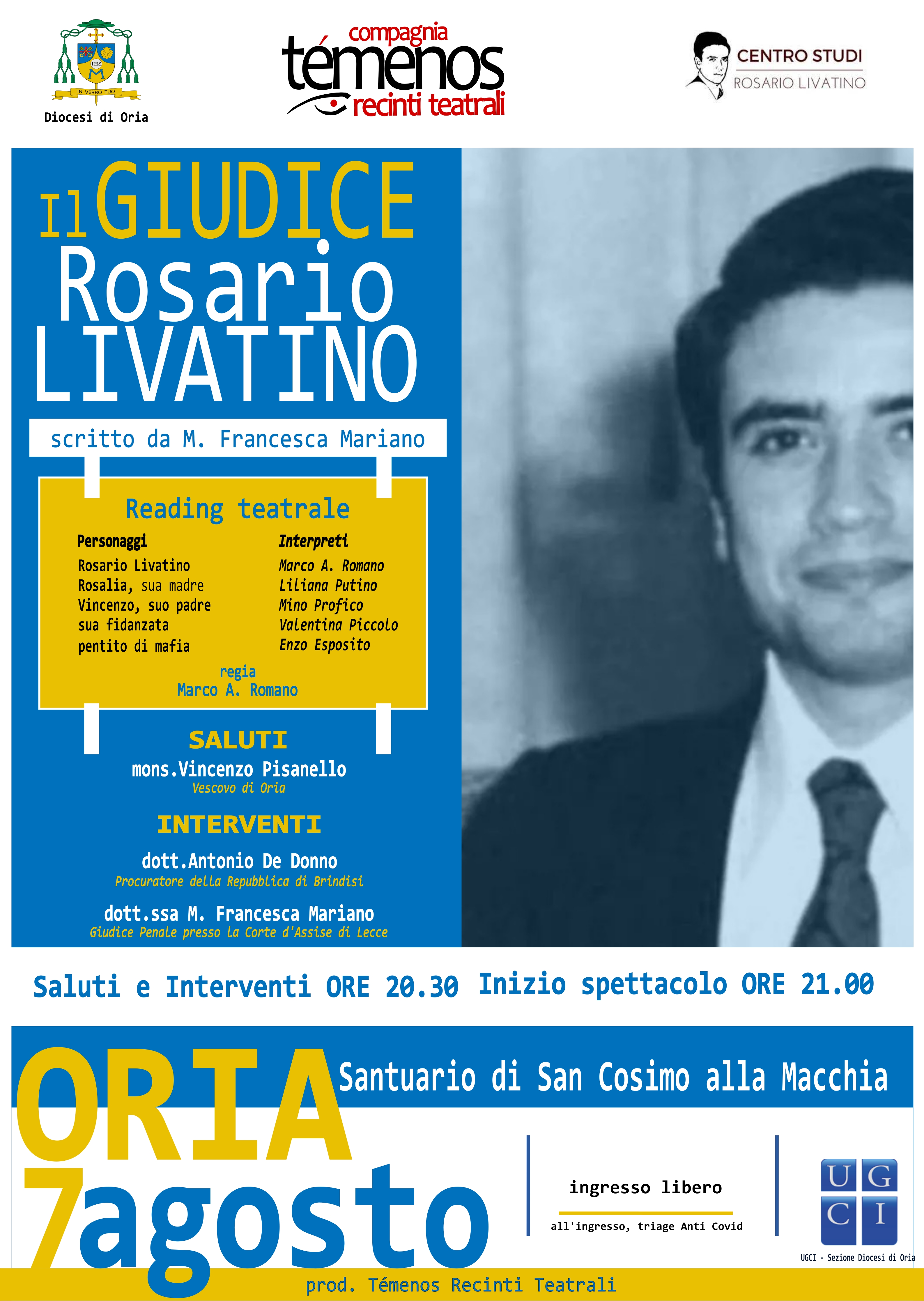 Sabato 7 agosto, alle ore 20.30, nel santuario di San Cosimo alla Macchia in Oria) la compagnia "Témenos - recinti teatrali" porterà in scena il reading teatrale "Il giudice Rosario Livatino" scritto da Maria Francesca Mariano e diretto da Marco Antonio Romano.