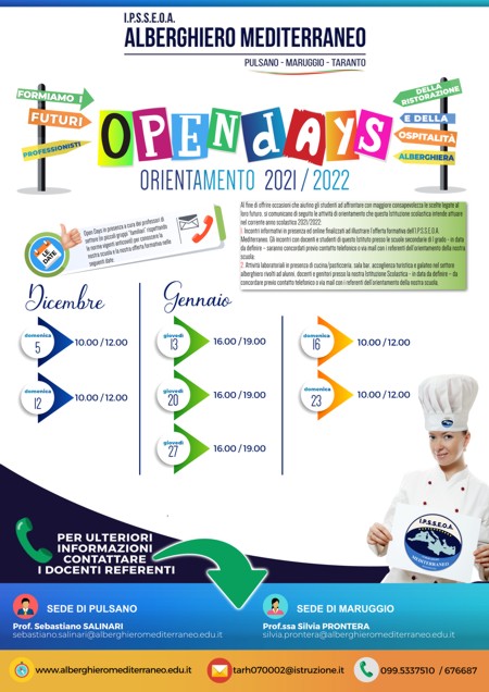 Agli incontri teorici seguiranno, per evidenziare al meglio i molteplici sbocchi lavorativi dei tre settori, attività laboratoriali di cucina, sala, accoglienza turistica e galateo nel settore alberghiero con l’obiettivo di far conoscere la vera essenza della nostra scuola dove gli studenti imparano facendo.