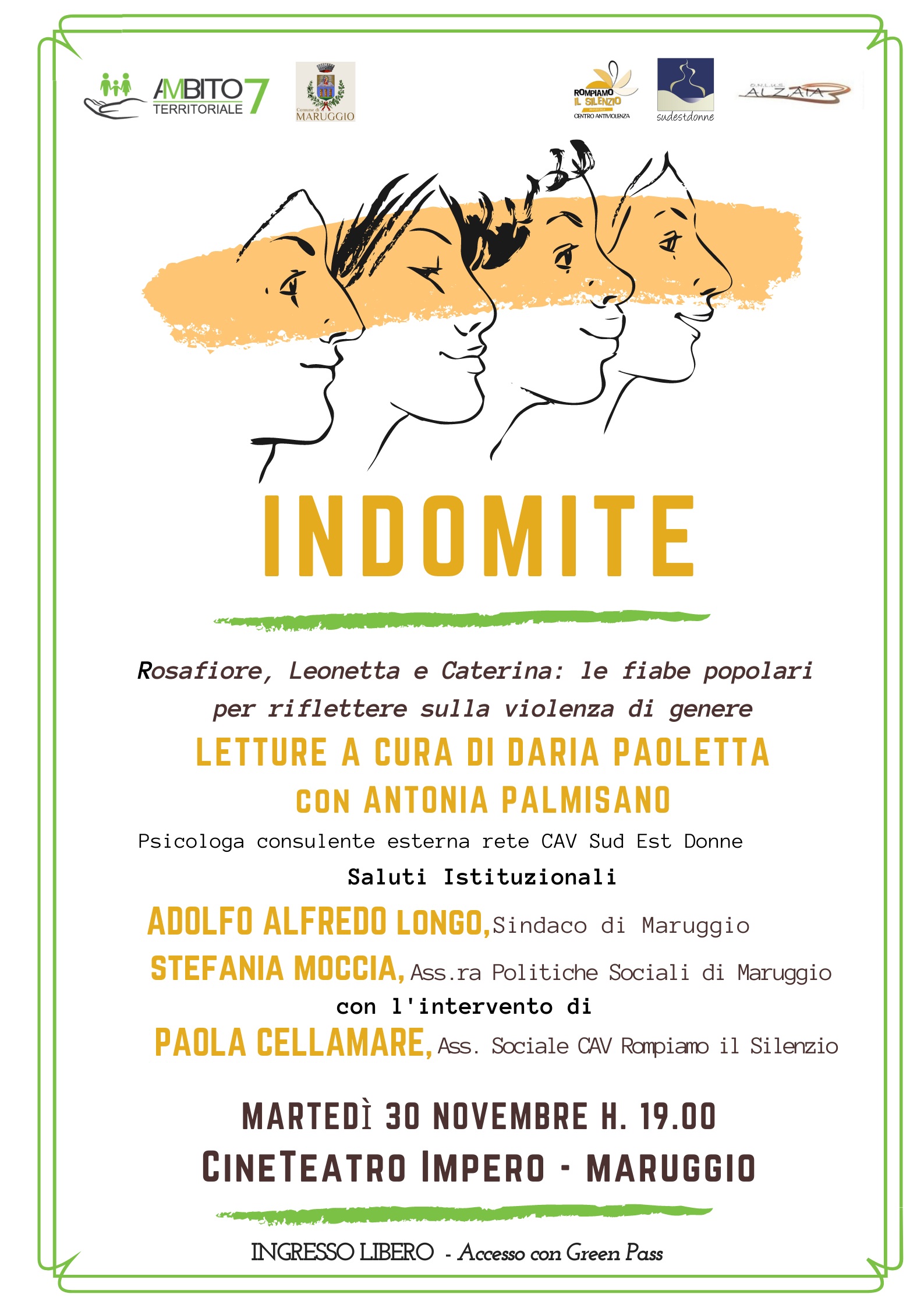 In occasione della Giornata Internazionale per l’eliminazione della violenza sulle donne, il Centro Antiviolenza Rompiamo il Silenzio di Manduria, in collaborazione con l’Ambito Territoriale Sociale n. 7 e il Comune di Maruggio, organizza, martedì 30 novembre, al CineTeatro Impero di Maruggio l’incontro pubblico “Indomite: le fiabe popolari di Italo Calvino per riflettere sulla violenza di genere”.