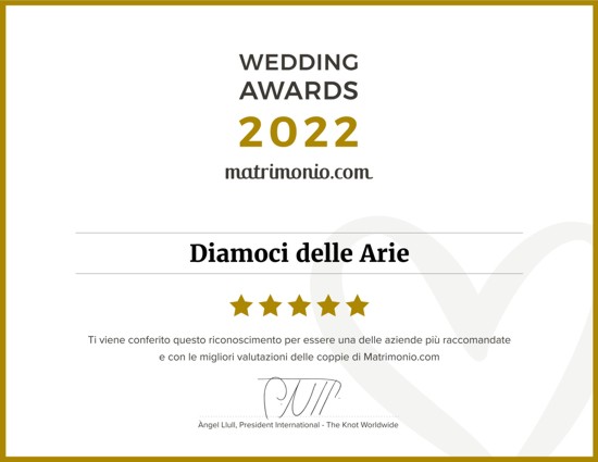 Diamoci delle Arie di Maruggio ha ricevuto il premio Wedding Awards 2022 nella categoria Bellezza e benessere. Si tratta di un premio di grande valore attribuito dalle coppie ai migliori fornitori di prodotti e servizi nuziali dell’anno.