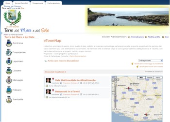 Per quanto riguarda la sezione di Partecipazione, è stata aperta una “eTownMap” che permette di discutere sulla pianificazione del territorio, per raccogliere nuove idee da trasformare poi in proposte reali, attraverso la presentazione di progetti per le diverse iniziative (Area Vasta Tarantina, POR Puglia 2007-2013, G.A.L., etc.). Lo scopo è quello di far emergere le proposte direttamente dal “basso” in base alle necessità reali dei cittadini e portare di conseguenza ad una maggior qualità del processo di pianificazione strategica.
