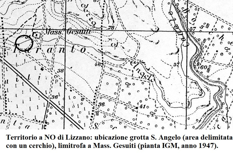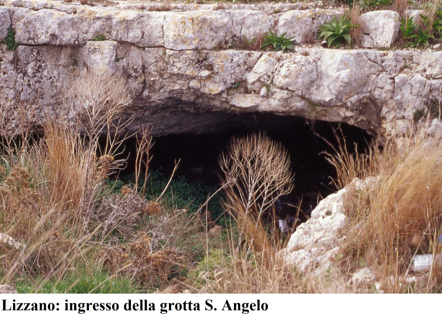 Grotta S. Angelo si pone sulle alture a Nord Ovest di Lizzano e si protende verso il Canale dei Cupi, antico alveo alluvionale che prosegue la sua corsa verso il mare, assumendo la denominazione di Canale Ostone. All’interno di questo profondo vallone si osservano grotte e cavità naturali, alcune adattate dall’uomo (probabilmente utilizzate fin dalla preistoria) tendenti a ricostruire il tipico habitat rupestre medievale riconoscibile in tante gravine pugliesi e materane (vedi P. TARENTINI, Lizzano. Quell’antica vita lungo l’Ostone, Manduria, Filo, 2003, pp. 47-49).