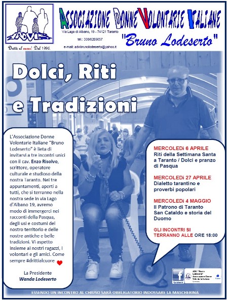 Il cuore dell’incontro, che si terrà nella sede dell’ADVI in via Lago d’Albano 19, sarà il dialetto tarantino e i proverbi popolari rivenienti dai racconti di un tempo. Canzoni, filastrocche, preghiere, modi di dire dei tarantini saranno raccontati da Risolvo che ha racchiuso il fruttuoso lavoro di ricerca approfondita su libri e documenti storici nella sua pubblicazione ‘U cigghie de le tarandine.