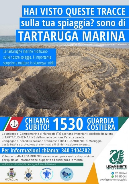 «Se camminando in spiaggia incontri queste orme, scatta una foto e contatta immediatamente il 1530 o per avere assistenza immediata ed istruzioni, chiama i volontari di Legambiente Maruggio al 340 3104202» è riportato in una nota di Legambiente, corredata dalla foto che vi proponiamo.