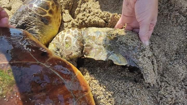 Salvata una tartaruga in difficoltà: lenza e reti stringevano il collo, ostruendo le vie aeree, e una pinna.