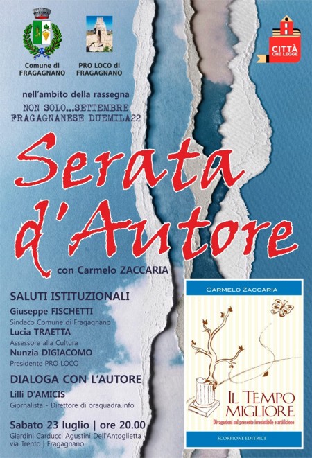 Sabato 23 luglio, alle ore 20, appuntamento con la rassegna “Serata d’Autore” nell’ambito del ricco programma estivo “Non solo … Settembre Fragagnanese 2022” organizzato dal Comune e dalla Pro Loco di Fragagnano.